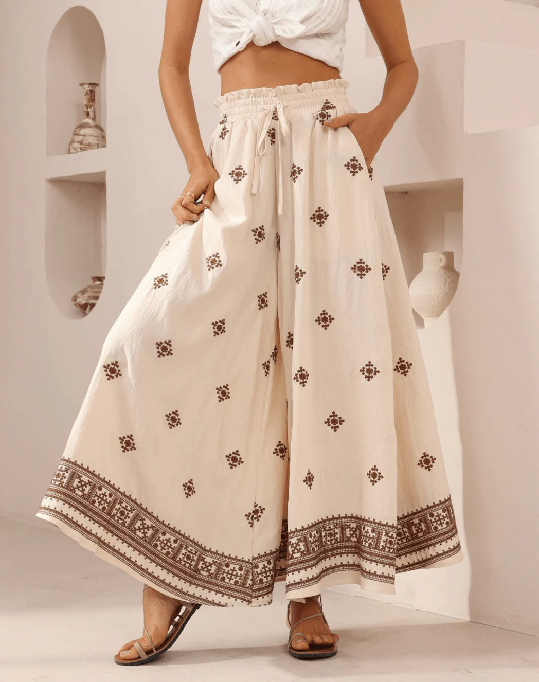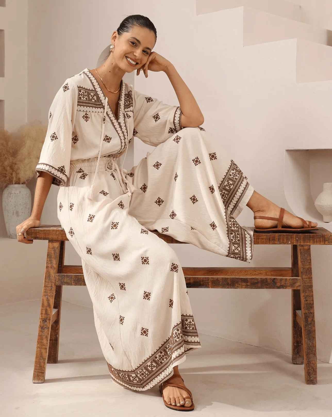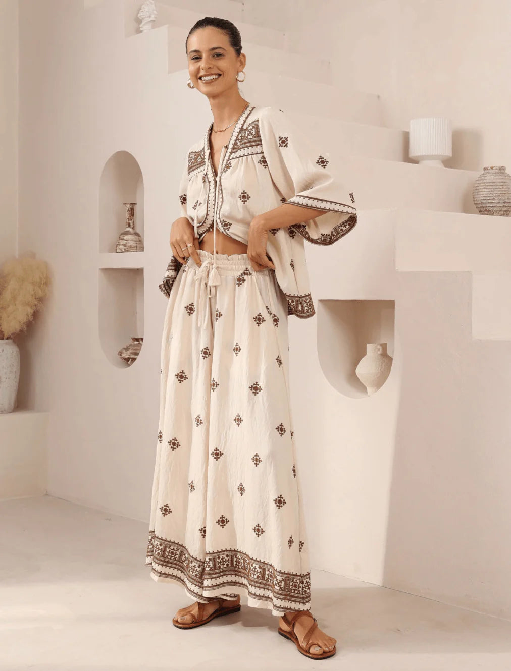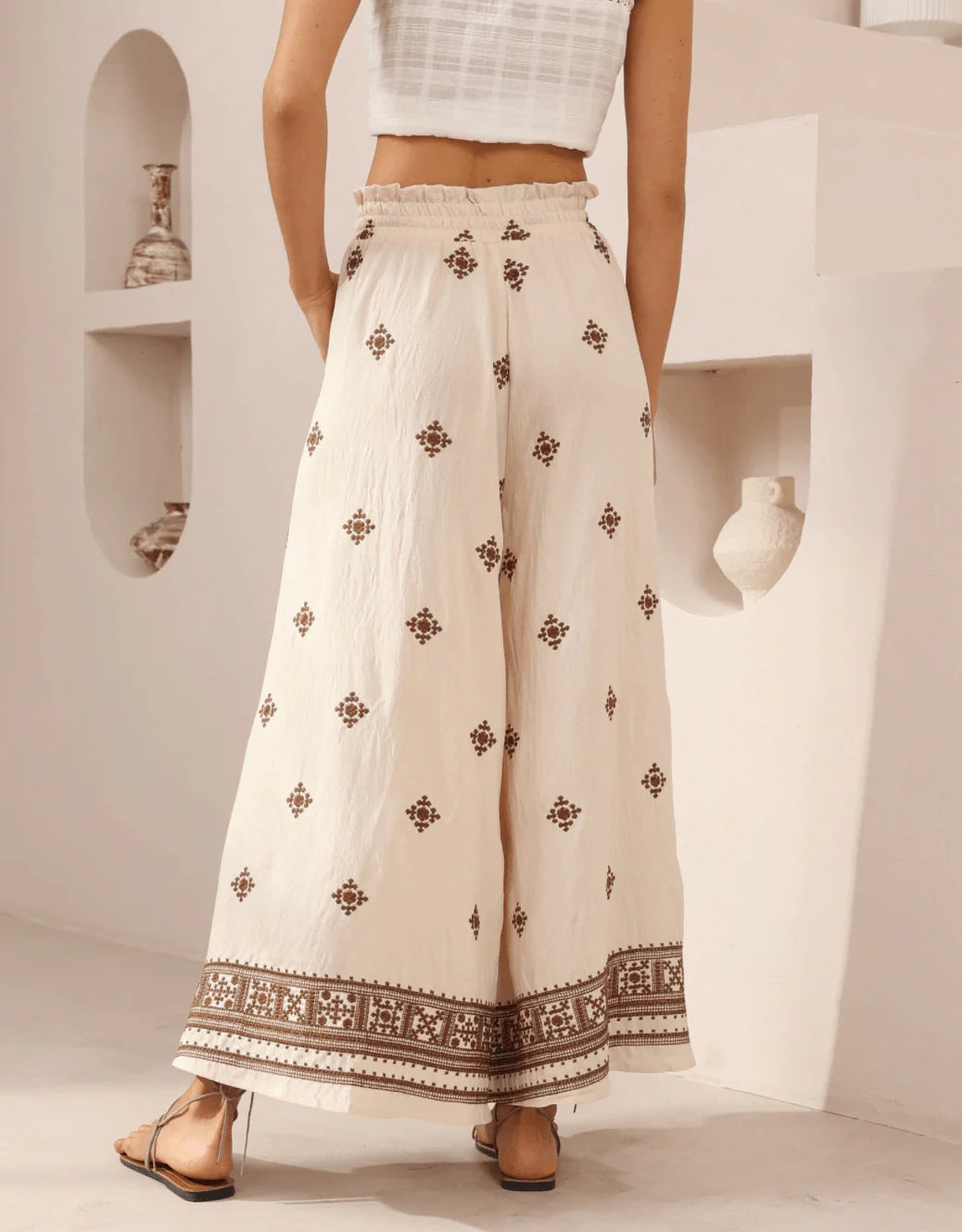 Iris Maxi Diamond Embroidered Wide Leg Pant - Beige/Brown