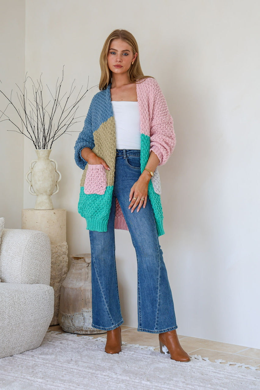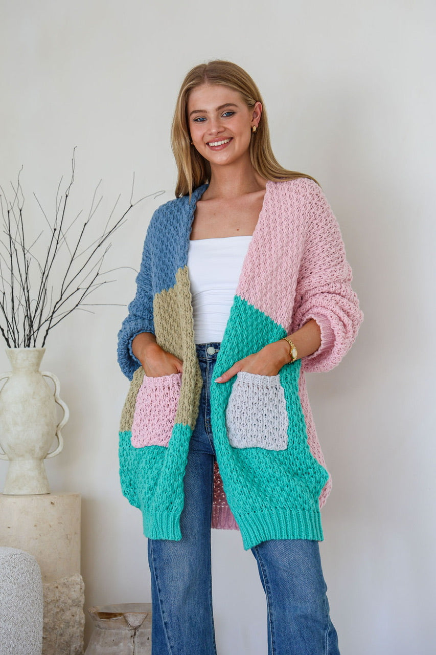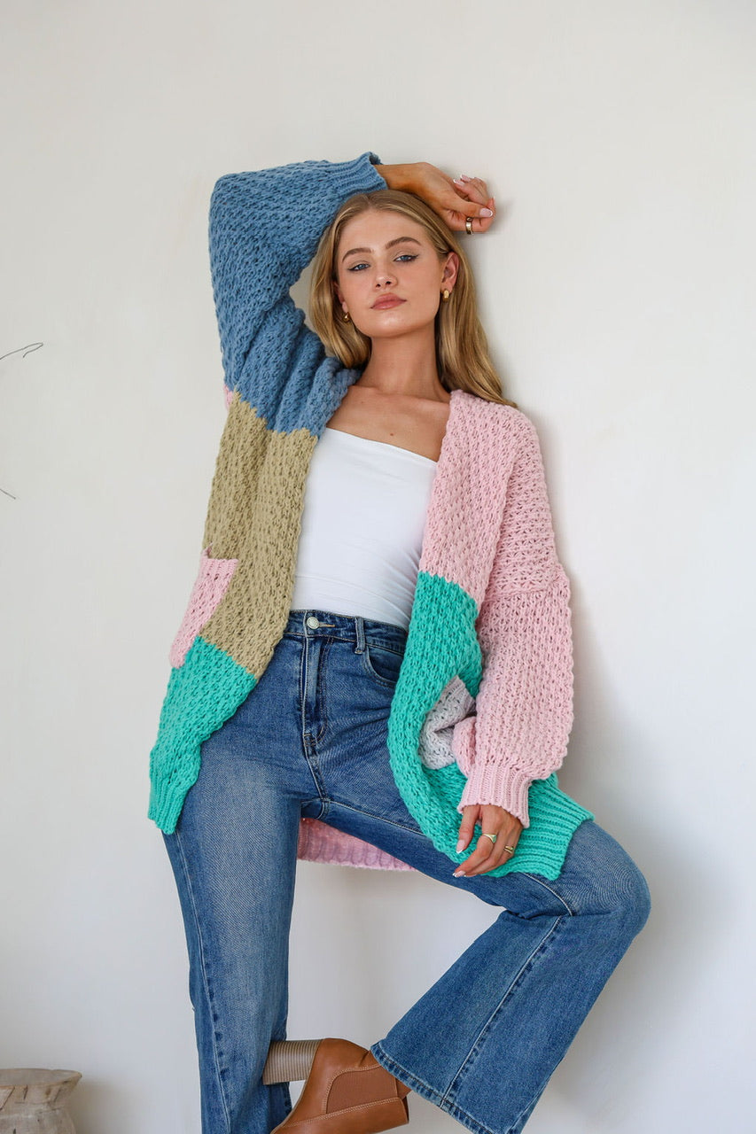 The Patchwork Halle Cardigan is a playful addition to any wardrobe! Featuring a fun mix of blue, pink, and green tones in a unique patchwork design, this oversized cardigan is both cozy and stylish.